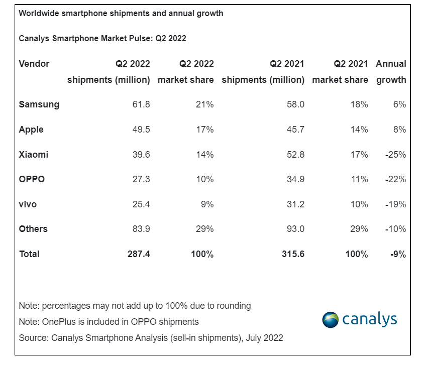 Аналитики Canalys подвели итоги второго квартала 2022 года на рынке смартфонов. Рынок за этот период просел на 9%.
