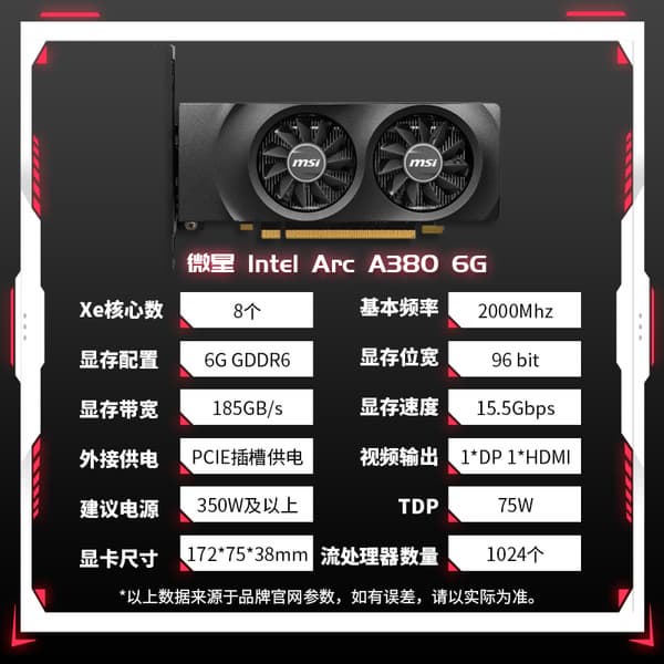 Карта от MSI лишена заводского разгона и работает с теплопакетом всего в 75 Вт. Тактовые частоты составляют 2000 МГц для графического чипа, который располагает 8 ядрами Xe. Arc A380 от MSI будет оснащена 6 ГБ памяти GDDR6 с частотой 15,5 Гбит/с. При этом у карты два вентилятора.