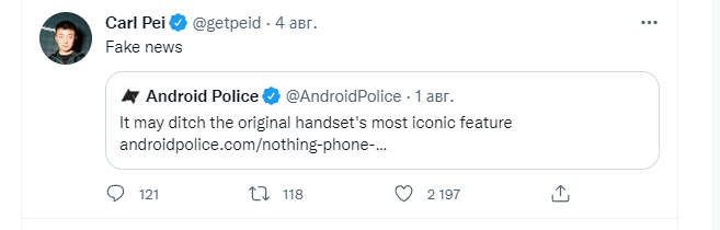 Пей заявил, что никакого упрощенного Nothing Phone (1) без светодиодов не планируется. Он коротко назвал эти «фейковыми новостями».