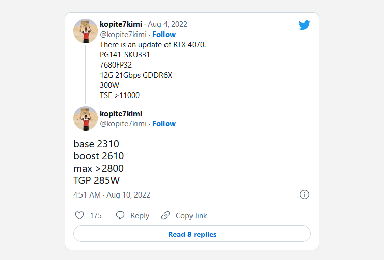 По данным kopite7kimi RTX 4070 будет потреблять 280 Вт, а RTX 4080 — 320 Вт. Ранее говорилось об уровне в 500 Вт и выше. Другие инсайдеры ранее утверждали, что RTX 4070 получит 12 ГБ памяти GDDR6X с пропускной способностью в 21 Гбит/с на 192-битной шине, 7680 ядер CUDA 48 МБ кеш-памяти L2 и до 160 ROP.