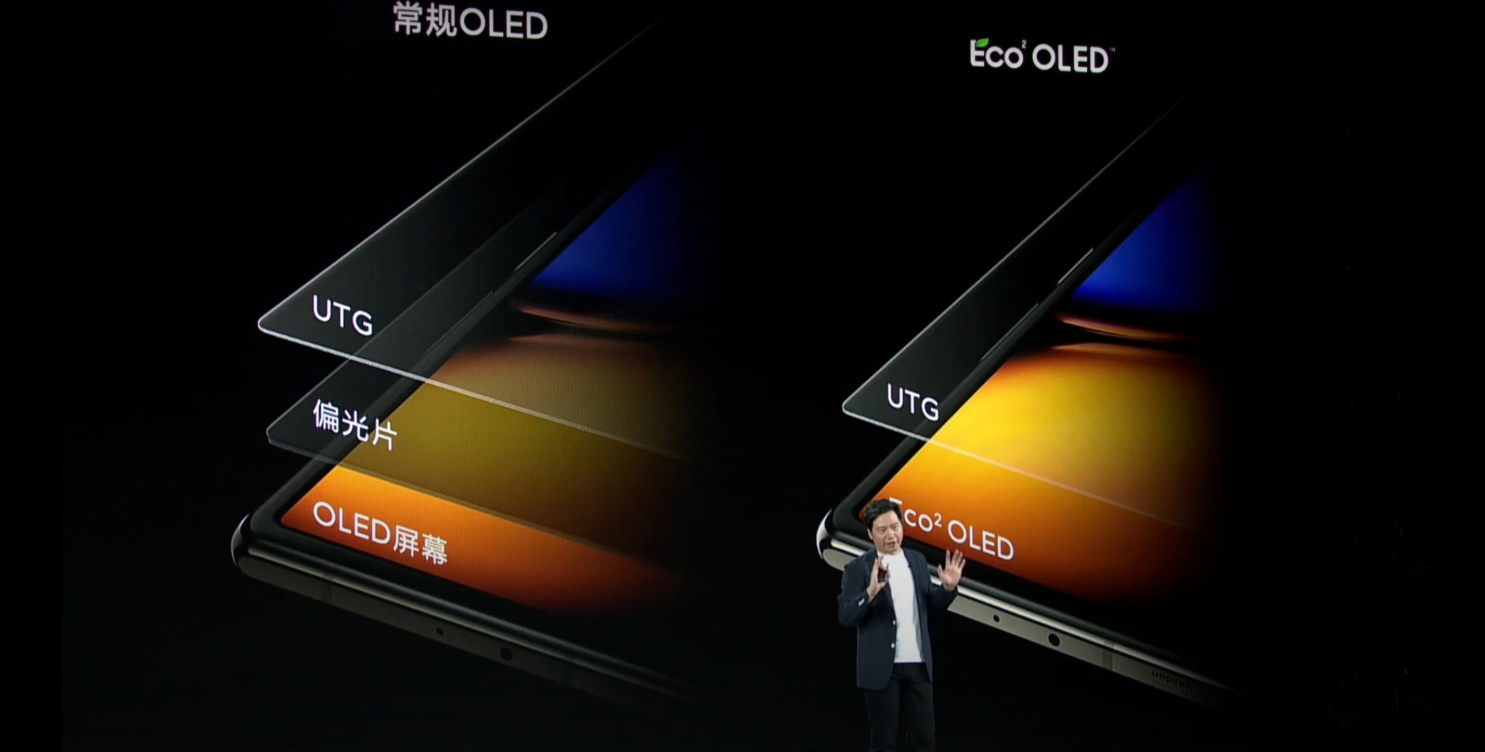 Внутренний дисплей Eco2 OLED Xiaomi Mix Fold 2 диагональю 8,02 дюйма и разрешением 2К. Смысл технологии Eco2 OLED заключается в упразднении одного слоя, за счет чего увеличивается яркость и улучшается цветопередача. Дисплей производится по технологии LTPO и поддерживает автоматическую регулировку кадровой частоты в широком диапазоне от 1 до 120 Гц. Защиту обеспечивает ультратонкое защитное стекло нового поколения с толщиной 0,03 мм.