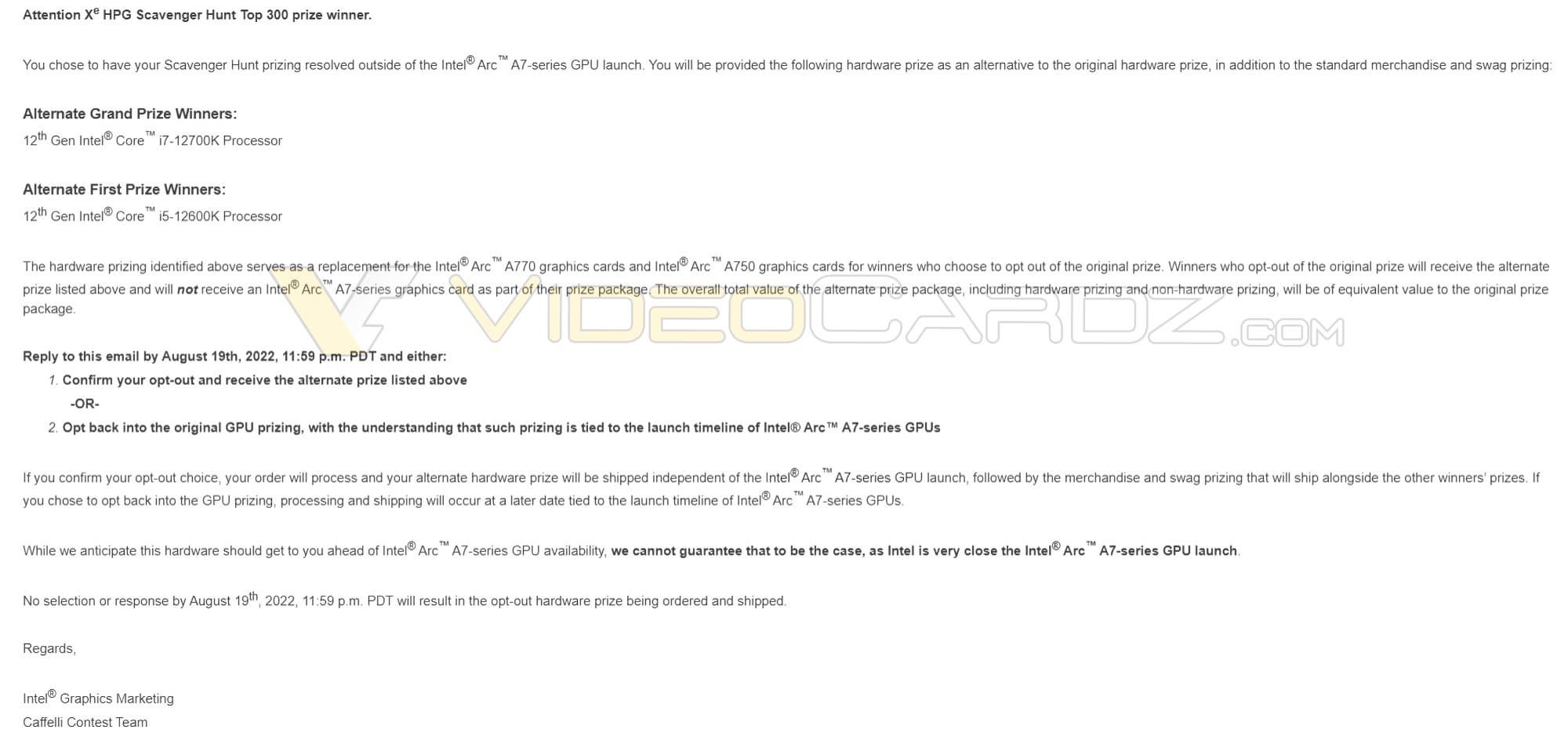Как отмечается, участники конкурса Xe HPG Scavenger Hunt могут выбрать в качестве приза процессоры Core i7-12700K и Core i5-12600K — это предлагается в виде альтернативы Arc A770 и Arc A750 соответственно. Таким образом, зная рекомендуемые цены на чипы, можно примерно рассчитать цены видеокарт.