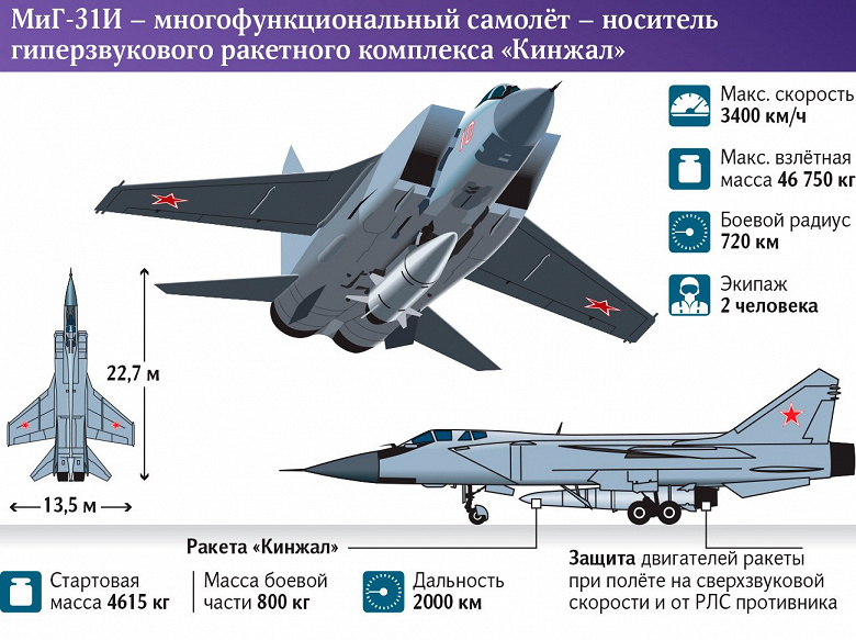 Как сообщают «Известия», ссылаясь на источники в Министерстве обороны РФ, основным носителем российских гиперзвуковых ракет «Кинжал» станет модификация боевых самолетов МиГ-31, которая получила индекс И.