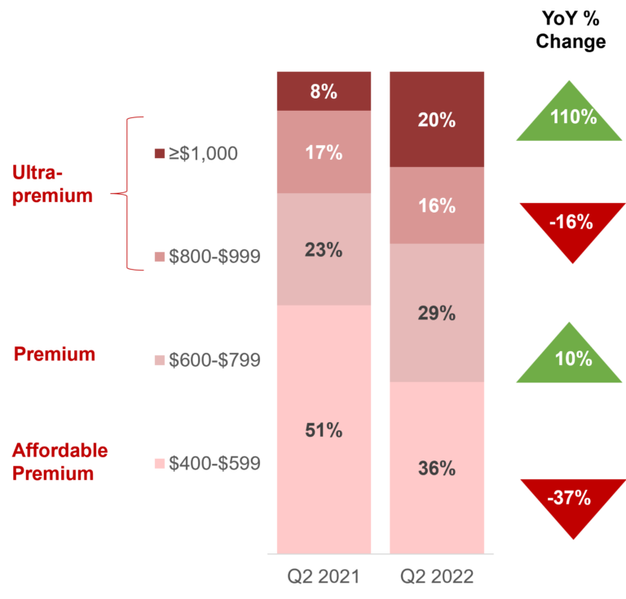 Стоит сказать, что аналитики, говоря о премиальном сегменте, имеют в виду смартфоны с ценой от 400 долларов и выше. В Китае на этот сегмент сейчас приходится 33% всех продаж. При этом, как можно видеть на диаграмме, сам он делится на несколько, и наибольшие продажи ожидаемо имеют место в сегменте 400–600 долларов, хотя за год ситуация сильно изменилась.