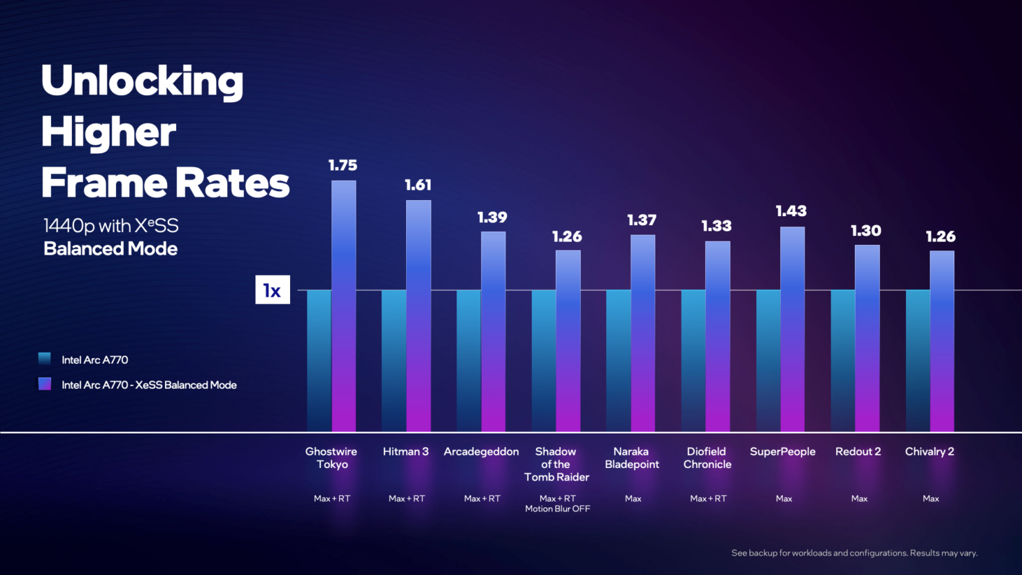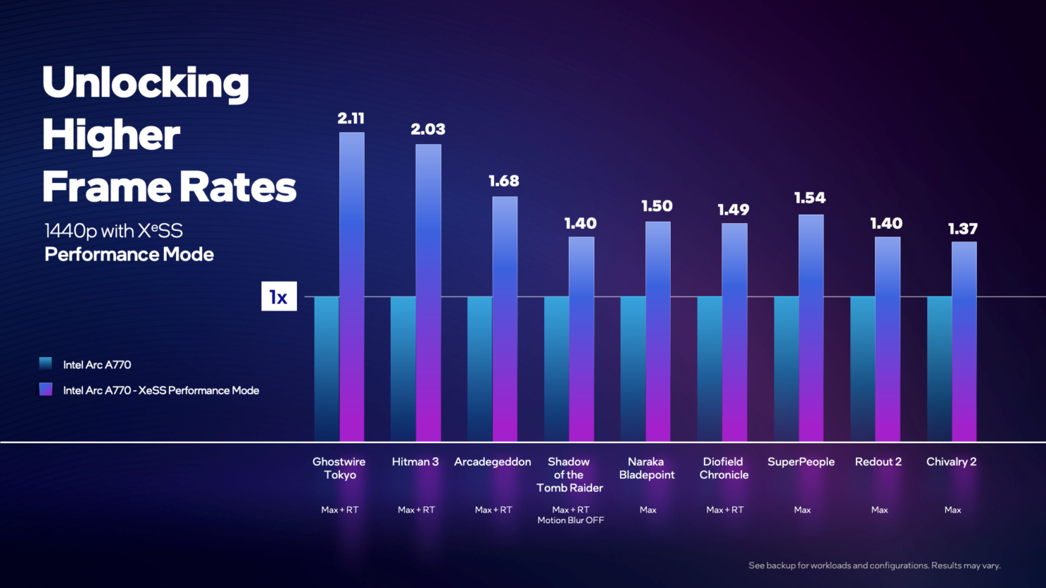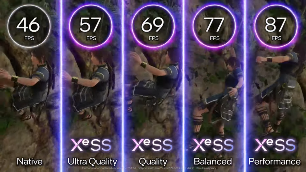 В этот раз Intel продемонстрировала работу XeSS, взяв 3D-карту Arc A770, которая ещё даже полноценно не представлена. Компания выбрала игру Shadow of The Tomb Raider в разрешении 1440p с активной трассировкой лучей. В итоге без XeSS карта показывала результат около 46 к/с, а с активной технологией обеспечивала уже от 57 до 87 к/с в зависимости от режима качества.