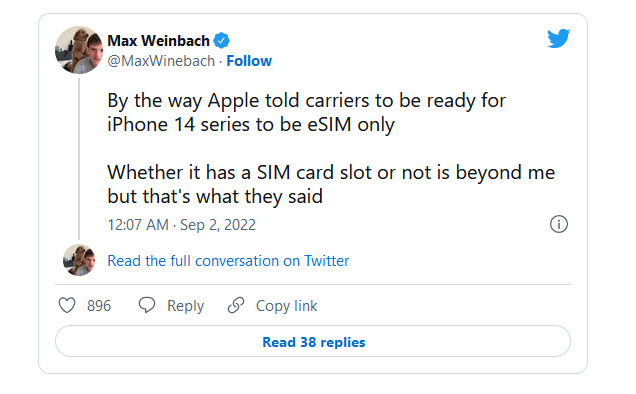 До анонса iPhone 14 остаётся несколько дней, и появляются всё новые подобности о будущих смартфонах. Инсайдер и редактор новостного ресурса XDA Developers Макс Вайнбах (Max Weinbach) рассказал, что некоторые версии смартфонов не получат физических SIM-карт.
