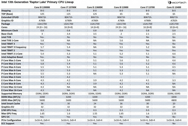 Опубликованные данные говорят о том, что у Intel будет четыре 24-ядерных процессора в новом семействе Core i9: 13900K, 13900KF, 13900 и 13900F. F-варианты – с отключенным графическим ядром, а разница между версиями с индексами К и без них – в частотах и TDP: 125 Вт против 65 Вт.