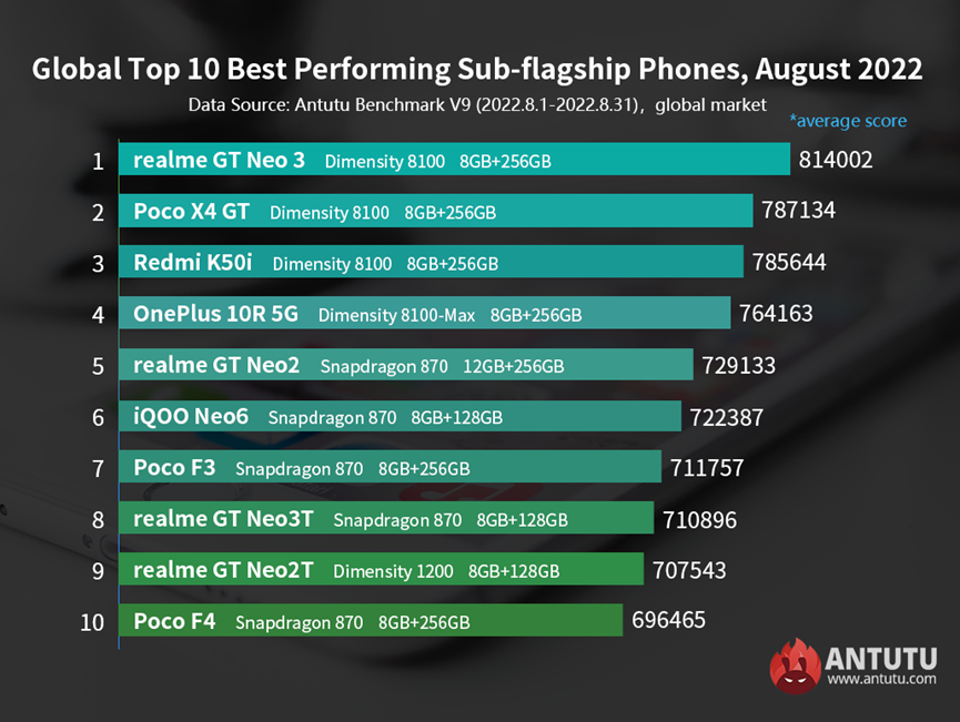 Команда бенчмарка AnTuTu опубликовала рейтинги субфлагманских моделей и моделей среднего уровня на основе операционной системы Android по состоянию на август 2022 года.