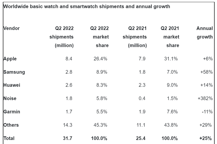 Тройку лидеров замкнула Huawei с ростом на 14%, до 2,6 млн часов. В пятёрку также вошли Noise (1,8 млн, рост на 382%) и Garmin (1,7 млн, падение на 11%).