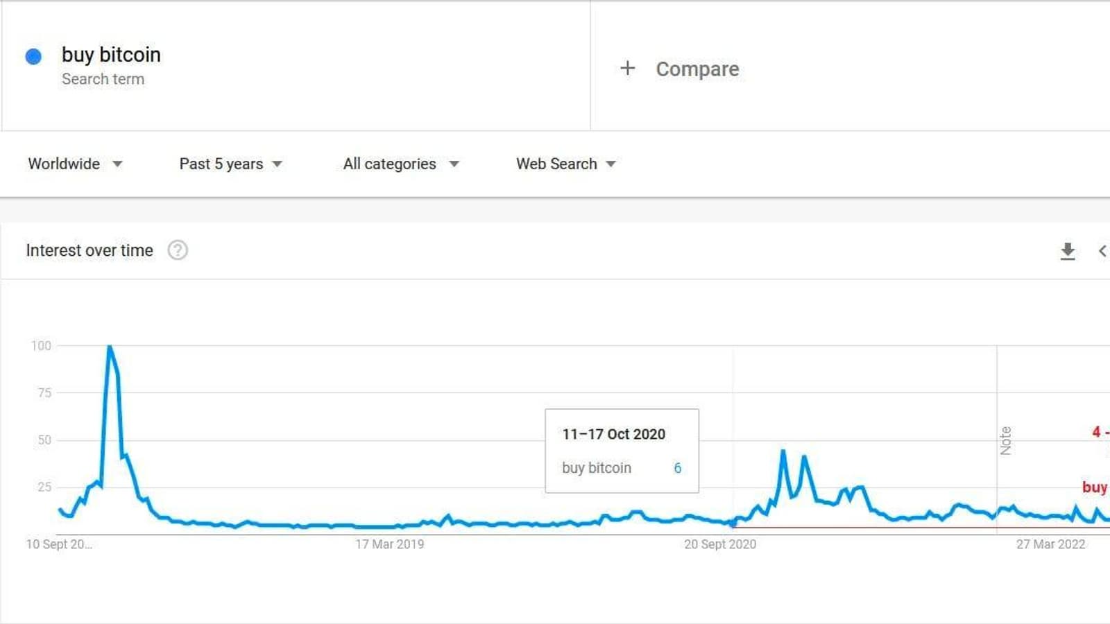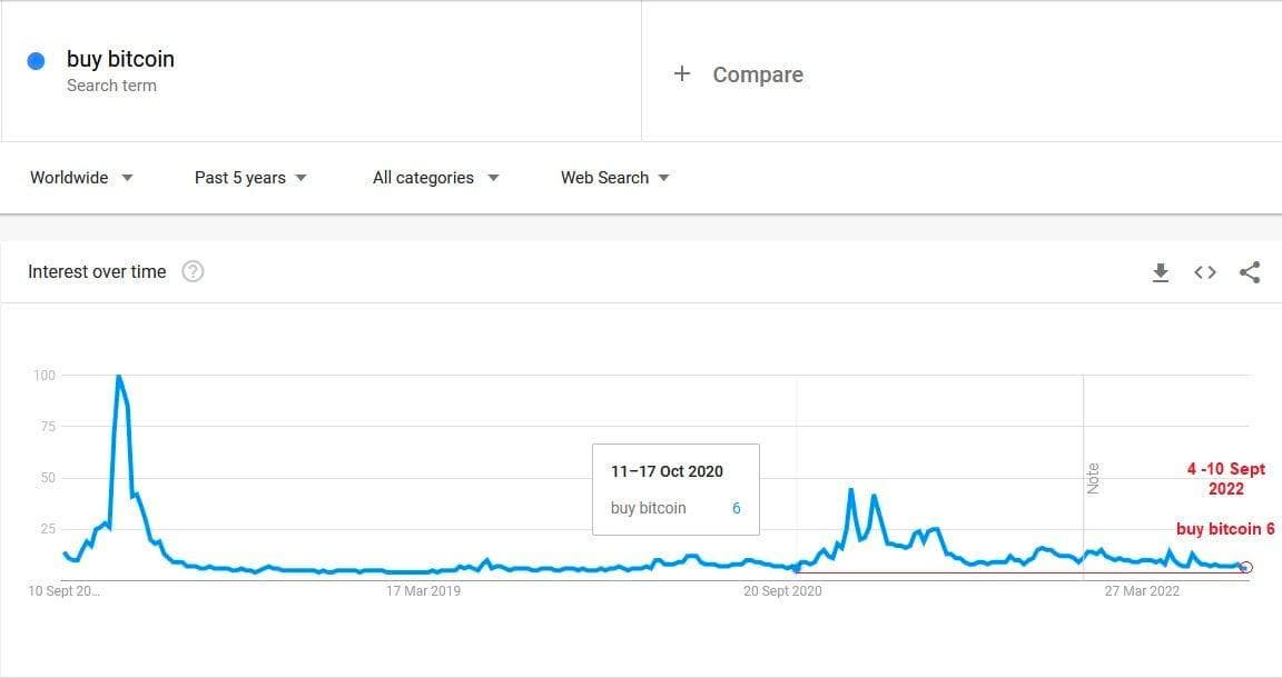 Интересно, что последний раз низкий интерес к ключевым словам был зафиксирован 17 октября 2020 года, когда криптовалюта готовилась к новому ралли, кульминацией которого стал бычий рынок 2021 года.