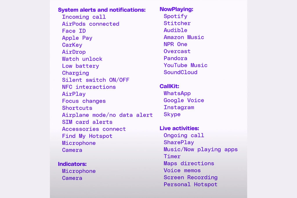 На момент запуска будет более 40 сценариев использования Dynamic Island как в нативных приложениях и функциях iOS 16, так и в сторонних. Блогер Маркес Браунли (MKBHD) опубликован полный список приложений и функций, поддерживаемых Dynamic Island. Он также показал, как Dynamic Island работает в реальной жизни. Маркес Браунли заявил, что «это будет самая копируемая функция другими производителями смартфонов в течение следующих 18 месяцев».