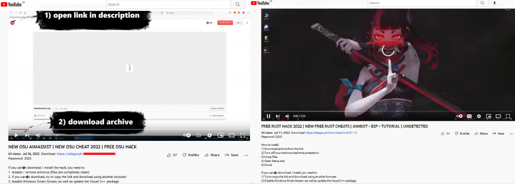 Они загружают видеоописания «читов» и «кряков», инструкции, как взломать ту или иную игру или ПО, в уже существующие каналы без ведома их владельцев, а в описания к ним добавляют ссылку на вредоносный RAR-архив. Если его скачать, он тут же начнёт самораспаковываться.