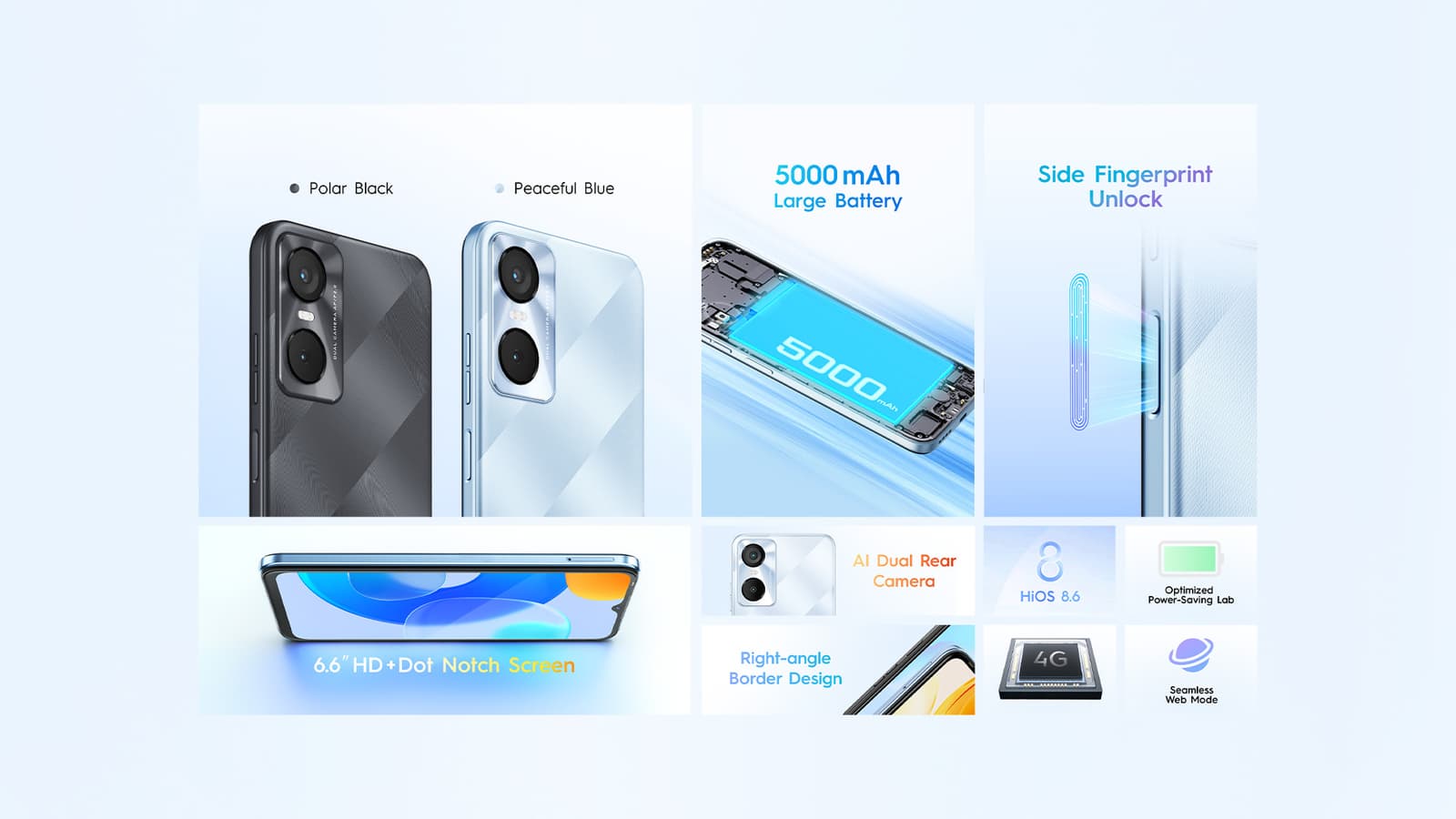 Сердцем служит неназванная четырёхъядерная SoC. У предшествующей модели это была MediaTek Helio A22. Из остального можно отметить экран HD+ диагональю 6,6 дюйма, аккумулятор ёмкостью 5000 мА•ч, фронтальную камеру разрешением 5 Мп и 32 ГБ флэш-памяти.