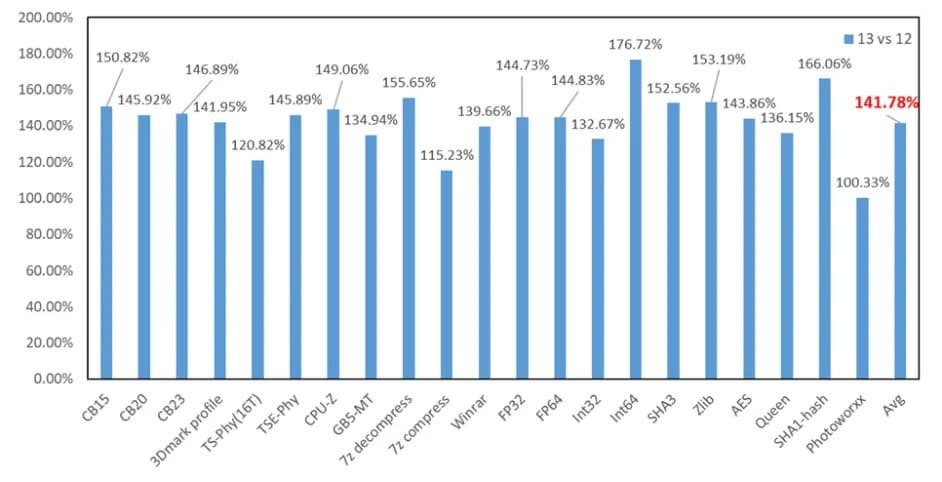 Как можно видеть, Core i9-13900K быстрее практически всегда. Единственное исключение — тест PhotoWorxx, где результаты идентичны. Что касается остальных тестов и задач, Core i9-13900K быстрее предшественника на величину от 15% до 77%. В среднем преимущество составляет 42%, и это очень много.