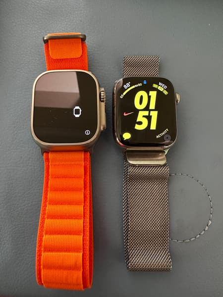 Пользователь сравнил Apple Watch Ultra с 45-миллиметровыми Apple Watch, которые он носил раньше. На фото хорошо видно, насколько велики Apple Watch Ultra. Он также заметил, что ремешок Apple Watch Ultra стало сложнее надевать и снимать.