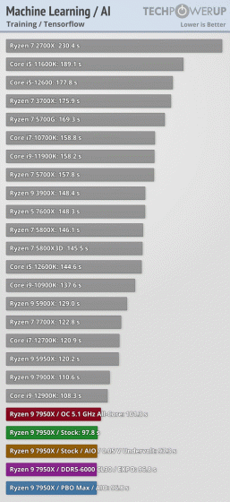 12-ядерный Ryzen 9 7900X примерно на 6% быстрее Core i9-12900K и на 15% опережает Core i7-12700K. Восьмиядерный Ryzen 7 7700X на 20% быстрее своего предшественника (Ryzen 7 5800X), при этом в ряде задач новинка умудряется обходить даже Core i9-12900K, хотя в среднем, конечно, последний быстрее. Что же касается народного шестиядерника Ryzen 5 7600X, он на 25% быстрее предшественника и нередко способен тягаться с Ryzen 9 5900X, у которого вдвое больше ядер! В среднем результаты, конечно, не столь впечатляющи, но для тех, кто пользуется определёнными приложениями, Ryzen 5 7600X может стать чуть ли не чудом.