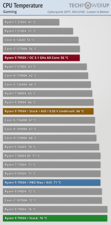 Греются новые процессоры AMD соответствующе. В том же приложении Blender новый флагман разогревается до 94 градусов, и это с использованием мощного кулера Noctua NH-U14S. И проблема в том, что даже Ryzen 5 7600X греется до 88 градусов, а Ryzen 7 7700X не отстаёт от флагмана. Снова-таки, в играх и более щадящих программах нагрев намного меньше: в пределах 70 градусов. И также стоит повторить, что это очень много на фоне Ryzen 5000, потому что Intel Alder Lake показывают не меньший нагрев.