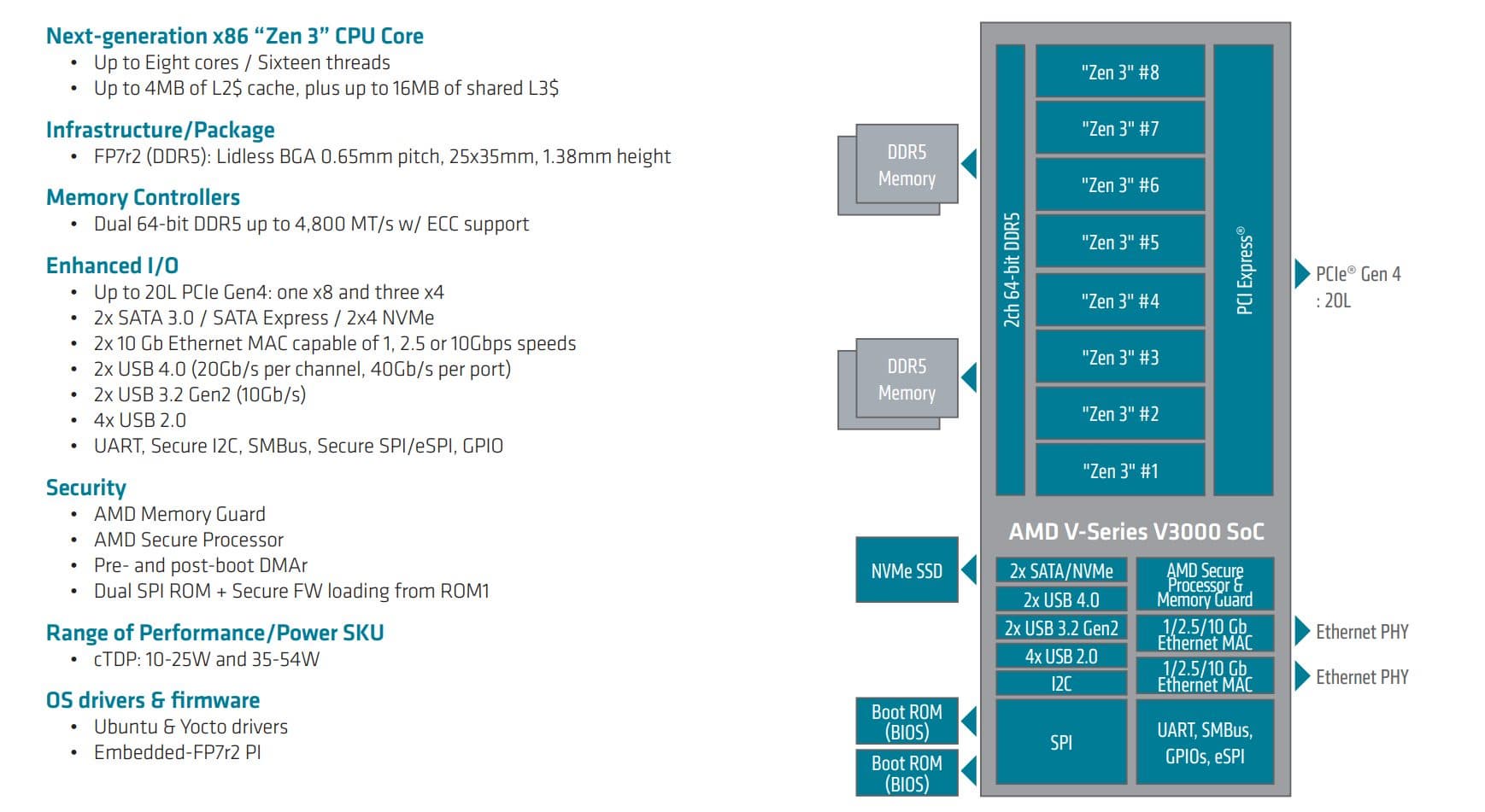 Мы разработали процессоры AMD Ryzen Embedded V3000 для клиентов, которые ищут баланс между высокой производительностью и энергоэффективностью для широкого спектра приложений в компактном корпусе BGA. Процессоры AMD Ryzen Embedded V3000 обеспечивают надёжный набор функций с расширенными преимуществами, необходимыми для превосходной производительности рабочих нагрузок в корпоративных и облачных хранилищах и в сетевых продуктах.