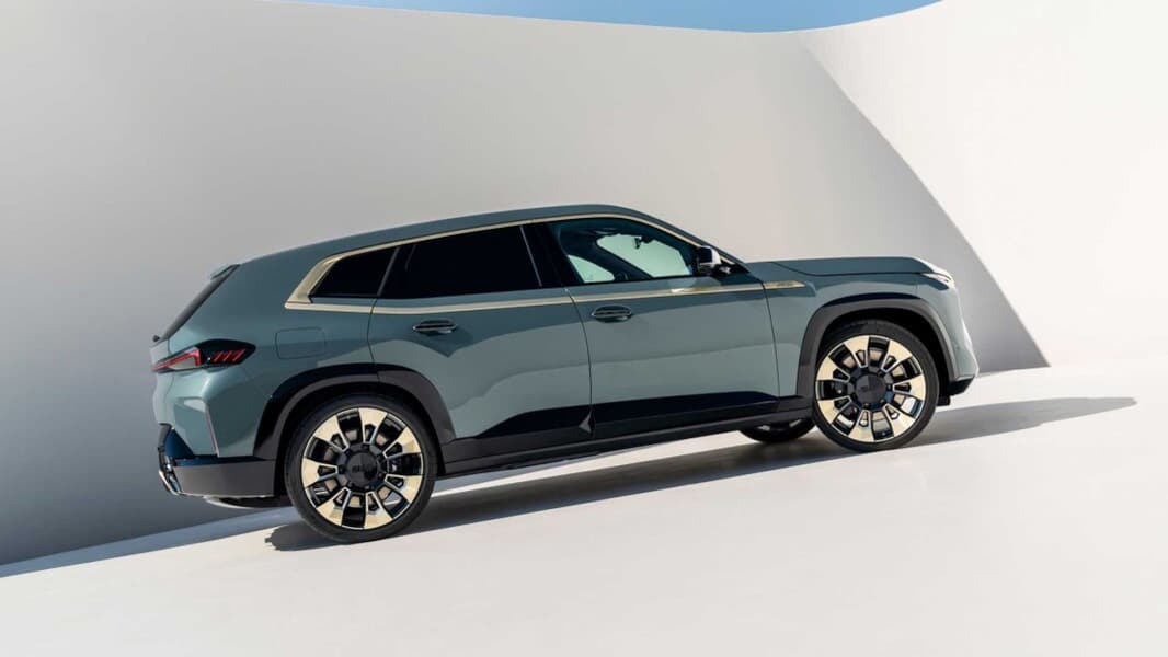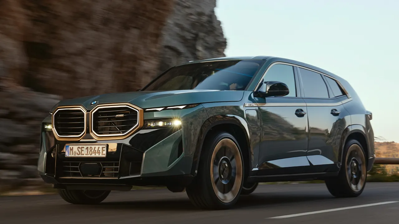 BMW XM представляет собой полноразмерный роскошный кроссовер длиной 5,1 метра и колёсной базой как у BMW X7 (3,1 мм). В экстерьере новой модели акцент сделан на золотые детали: колёсные диски, кромка стёкол, окантовка решётки радиатора и другие элементы кузова.