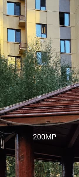 На фотографиях ниже можно видеть один и тот же объект, снятый в трёх разных режимах: 12,5 Мп (по умолчанию), режим 50 Мп и режим 200 Мп.