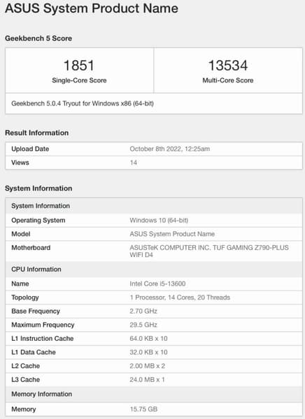Core i5-13600 тестировали в составе сборки с материнской платой Asus на чипсете Intel Z790 и с 16 ГБ оперативной памяти DDR5. Как видно на скриншоте, бенчмарк неправильно определил максимальную частоту процессора. Но остальные параметры, судя по всему, корректны.
