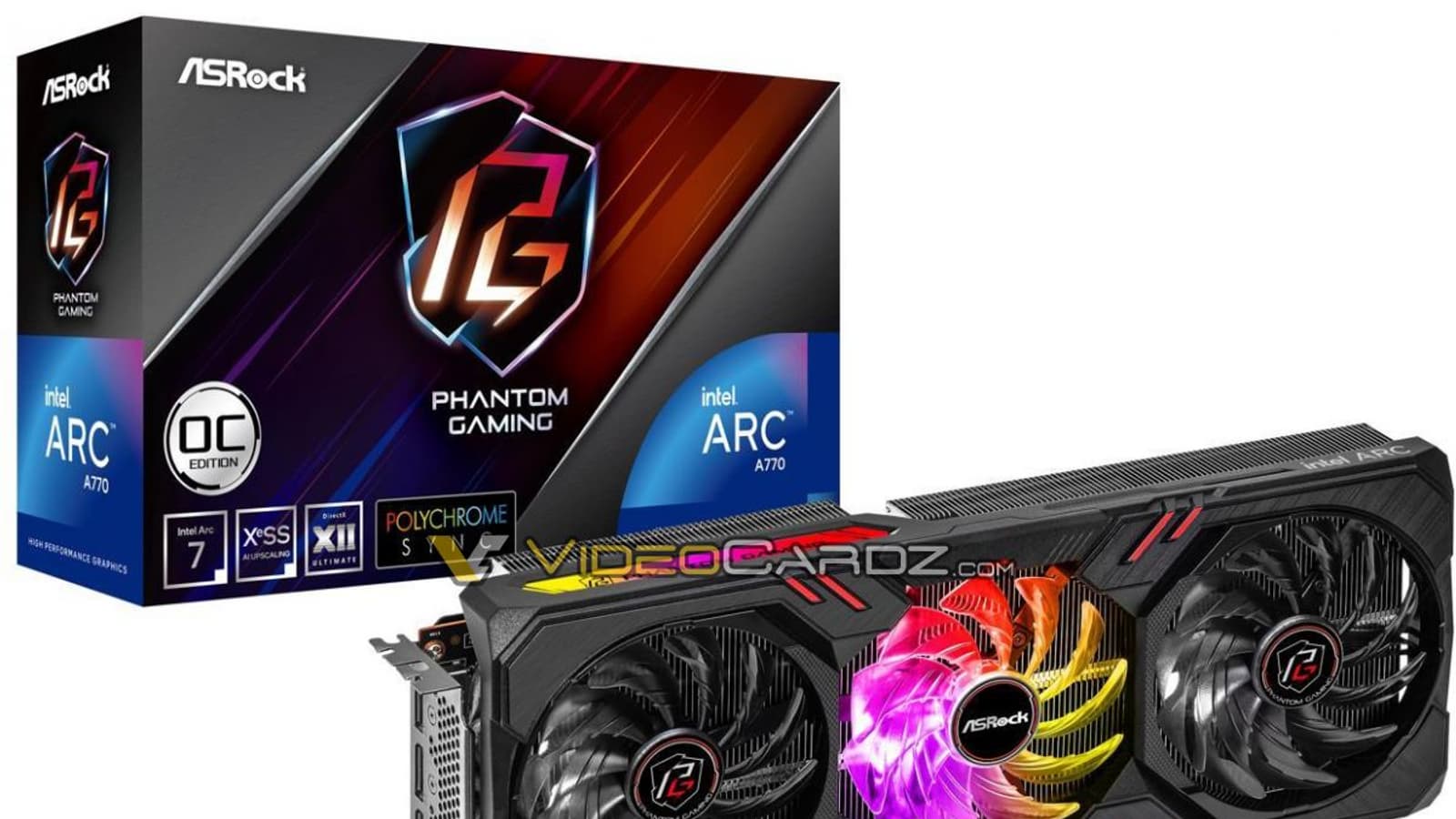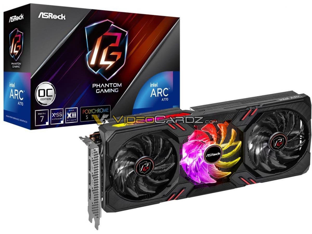 У ASRock выйдет версия A770 с дизайном Phantom Gaming, тремя вентиляторами и шириной в 2,5 слота. Точных характеристик пока нет, но в этой версии полноценный графический процессор ACM-G10 с 32 ядрами Xe. Также, похоже, будут варианты на 8 и 16 ГБ памяти.