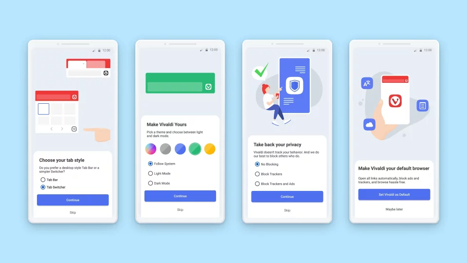 В Vivaldi 5.5 для Android появился мастер начальных настроек, хорошо знакомый пользователям десктопной версии Vivaldi. Эти настройки будут видны тем, кто устанавливает браузер впервые. Пользователь поэтапно сможет выбрать вид вкладок и тему оформления, настроить блокировщик слежки и рекламы, сделать Vivaldi браузером по умолчанию.