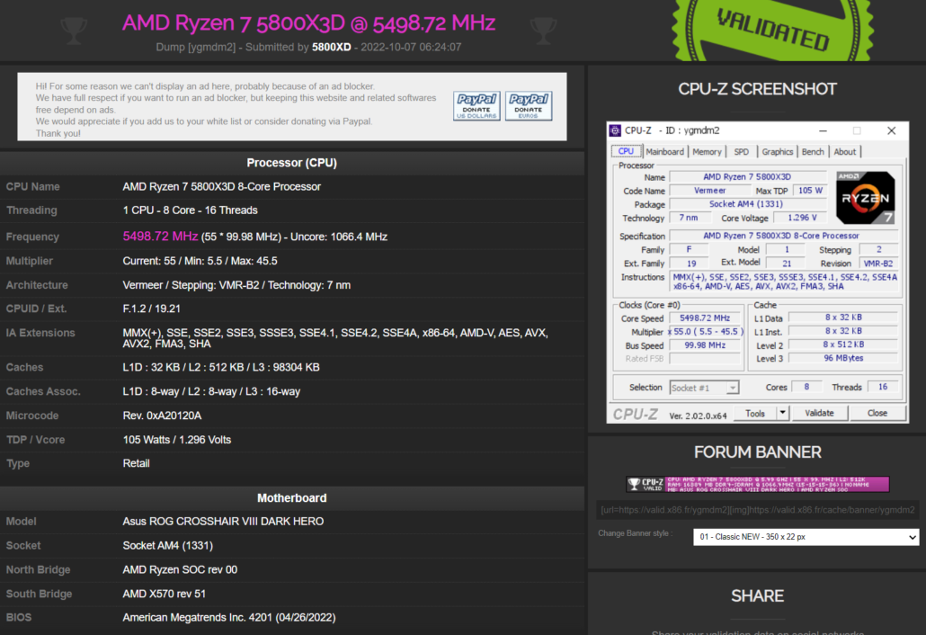 Так как микросхема 3D V-Cache рассчитана только на 1,35 В (и, соответственно, напряжение ядра существенно не поднять), энтузиасту пришлось установить множитель на 55. Напряжение ядра при этом составило 1,296 В.