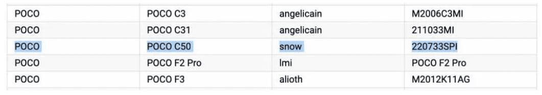 Не только сверхдешевый, но и в очередной раз переименованный - таким будет Poco C50. Аппарат засветился в каталоге Google Play Console c кодовым именем snow и каталожным номером 220733SPI. С точно таким же номером ранее дебютировал сверхдоступный Redmi A1, так что Poco C50 будет лишь его переименованным клоном.