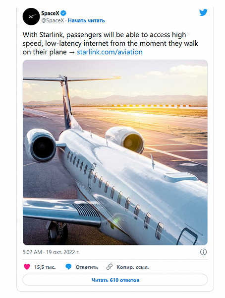 Компания SpaceX анонсировала скорый запуск сервиса Starlink Aviation, который обеспечит самолёты высокоскоростным интернетом с низкими задержками сигнала. Запуск планируется с 2023 года, в Twitter-аккаунте компании заявлено, что сервис появится на борту ряда самолётов.