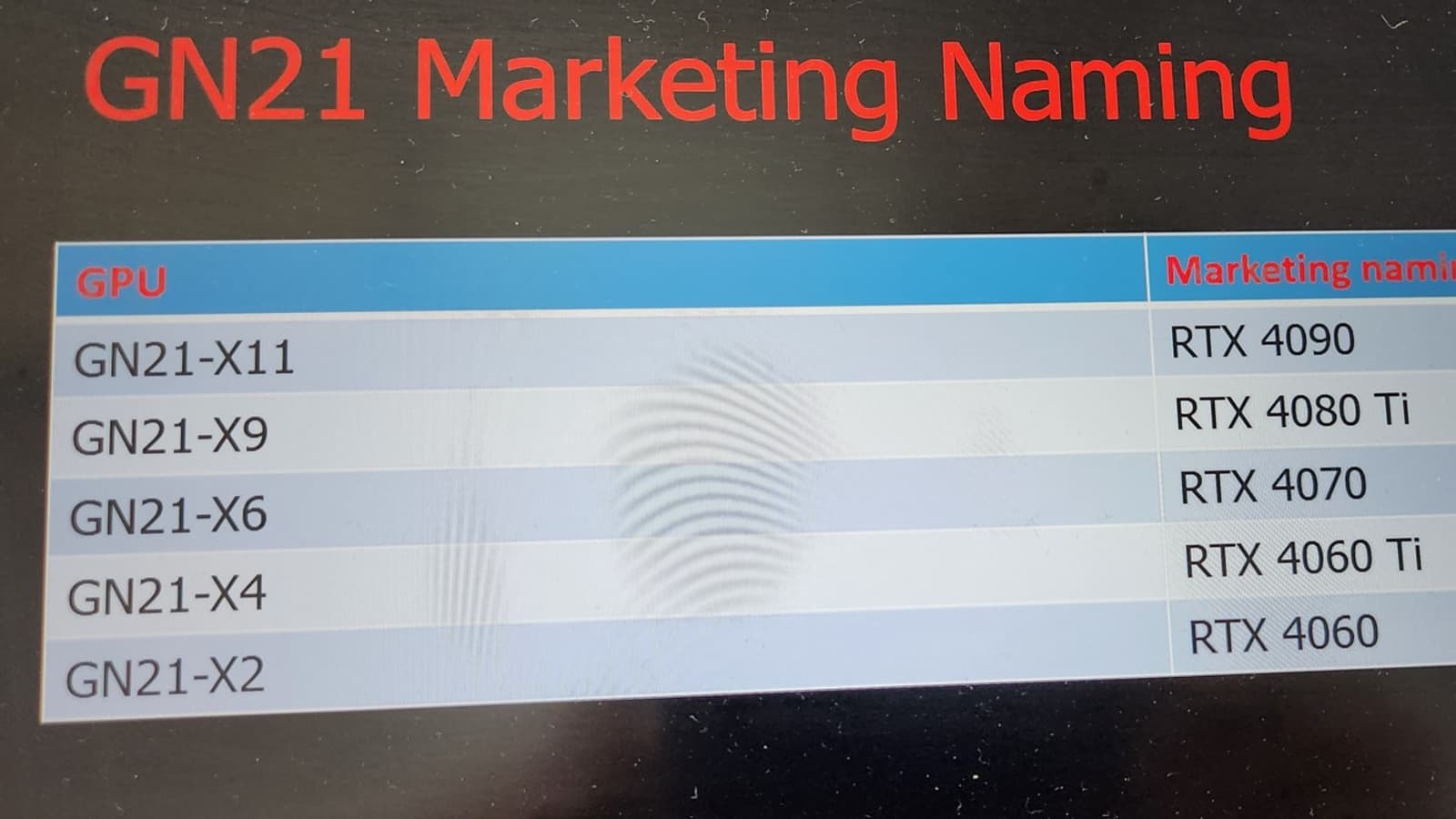 Слухи о том, что Nvidia готовит линейку мобильных GPU GeForce RTX 40, ходят давно, а сейчас в Сети появилось очередное свидетельство этого. На слайде ниже перечислены модели всей серии.