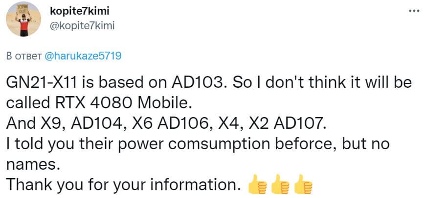 Новые данные сходятся с тем, что писал об этих видеокартах известный инсайдер Kopite7kimi еще весной. Только тогда он не приводил рыночные названия (маркетинговые обозначения) GPU, а ограничился лишь кодовыми обозначениями. Согласно данным Kopite7kimi, GeForce RTX 4090 будет основана на GPU AD103, RTX 4080 Ti будет построена на GPU AD104, RTX 4070 – на AD106, а в GeForce RTX 4060 и RTX 4060 Ti будет использоваться GPU AD107 в разных конфигурациях.