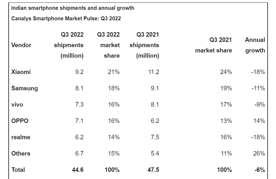 Даже Xiaomi и Realme не смогли сопротивляться тенденциям на рынке смартфонов. Аналитики Canalys оценили рынок смартфонов Индии по итогам третьего квартала текущего года и пришли к выводу, что рынок просел на 6%.