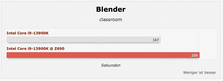 Большая разница (но уже не 25%, а 20%) в Blender: Core i9-13900K, установленный в системную плату на чипсете Z690, на выполнение задания тратит больше времени.