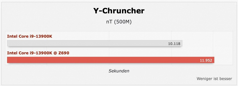 Куда меньшая разница (но все равно она заметна) в вычислительном тесте Y-Cruncher: Core i9-13900K с системной платой на чипсете Z790 справляется на 1,8 с быстрее.