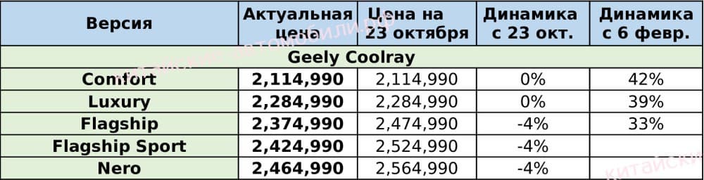 Таким образом, цены на Geely Coolray в трёх комплектациях из пяти снизились на 4%. Актуальный диапазон стоимости составляет на данный момент 2,11–2,46 млн рублей.