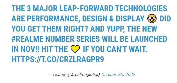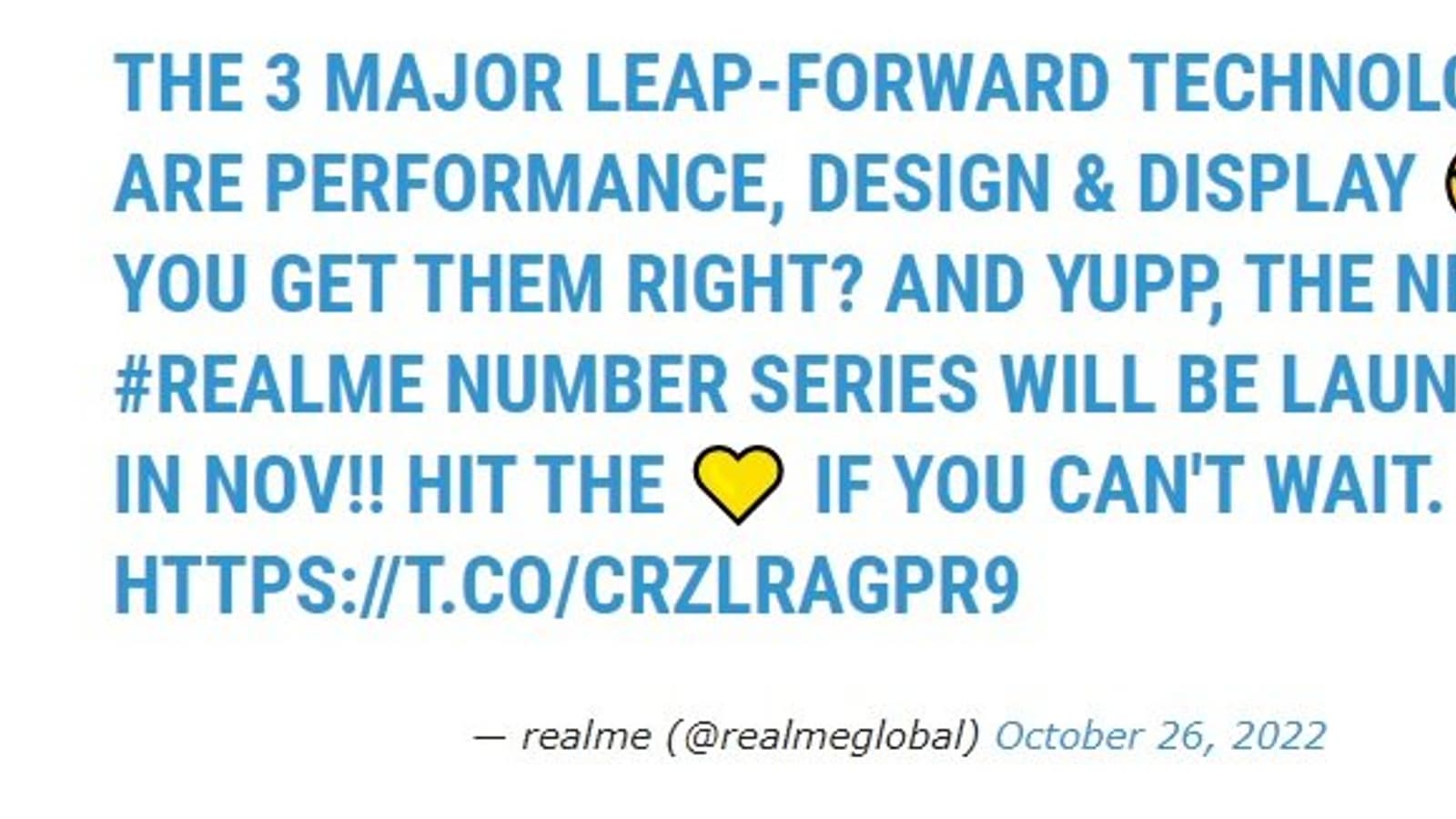 Появились более точные данные о дате выпуска новых смартфонов Realme 10. До этого было известно, что релиз моделей Realme 10 и Realme 10 Pro+ не за горами, но точных сведений не было. Теперь вице-президент компании Realme Мадхав Шет (Madhav Sheth) опубликовал в своём Twitter сообщение о том, что новая серия смартфонов появится в ноябре. Точную дату Шет всё же не назвал, однако, согласно более ранним утечкам, Realme 10 и Realme 10 Pro+ будут представлены 5 ноября в Китае. Сертификацию местного Центра телекоммуникационного оборудования (TENAA) они уже прошли.