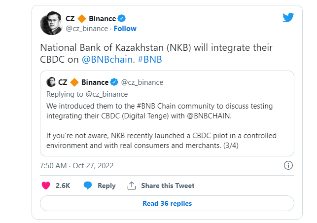 По словам Чжао, компания представила двух официальных лиц сообществу BNB Chain для обсуждения тестирования блокчейна для интеграции цифровой тенге.