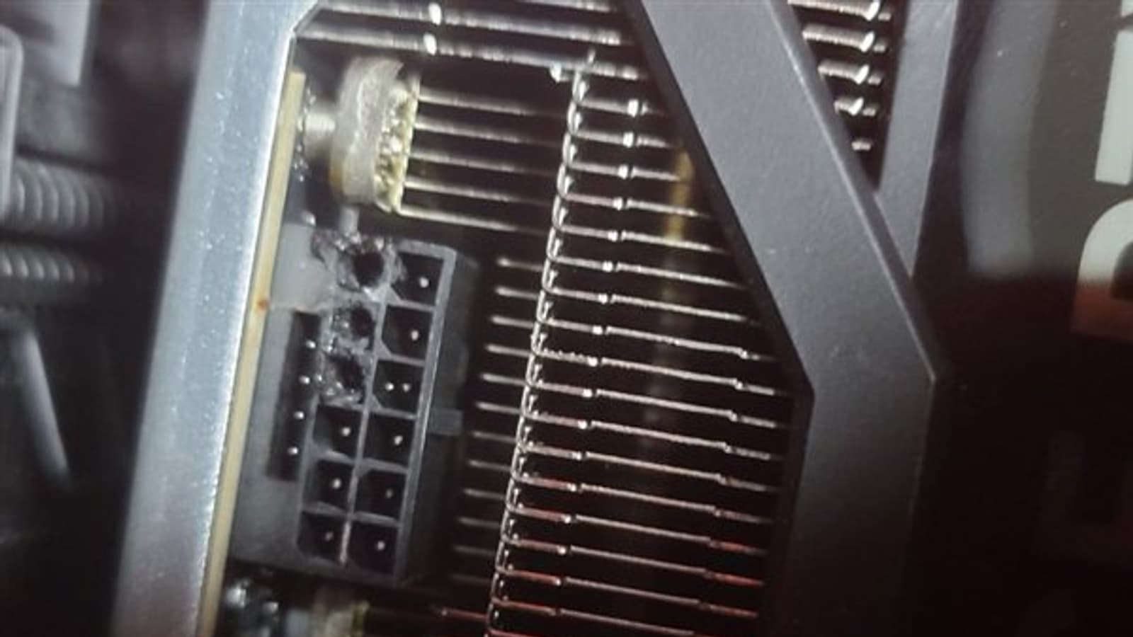 Расплавился 16-контактный разъём питания на самой плате и разъём на кабеле-переходнике. Судя по всему, частично оплавилась печатная плата. Но даже если в целом работоспособность видеокарты не нарушена, то работать она всё равно не будет, так как подать питание на неё без замены разъёма невозможно.