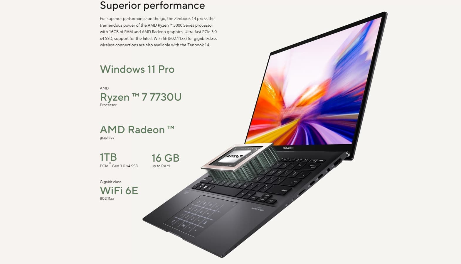 Модель называется Zenbook 14 (UM3402). Что интересно, прямо в названии Asus указывает на использование Ryzen 5000 Series, в описаниях почти везде также упоминается именно эта линейка, но инфографика говорит об использовании некоего Ryzen 7 7730U.