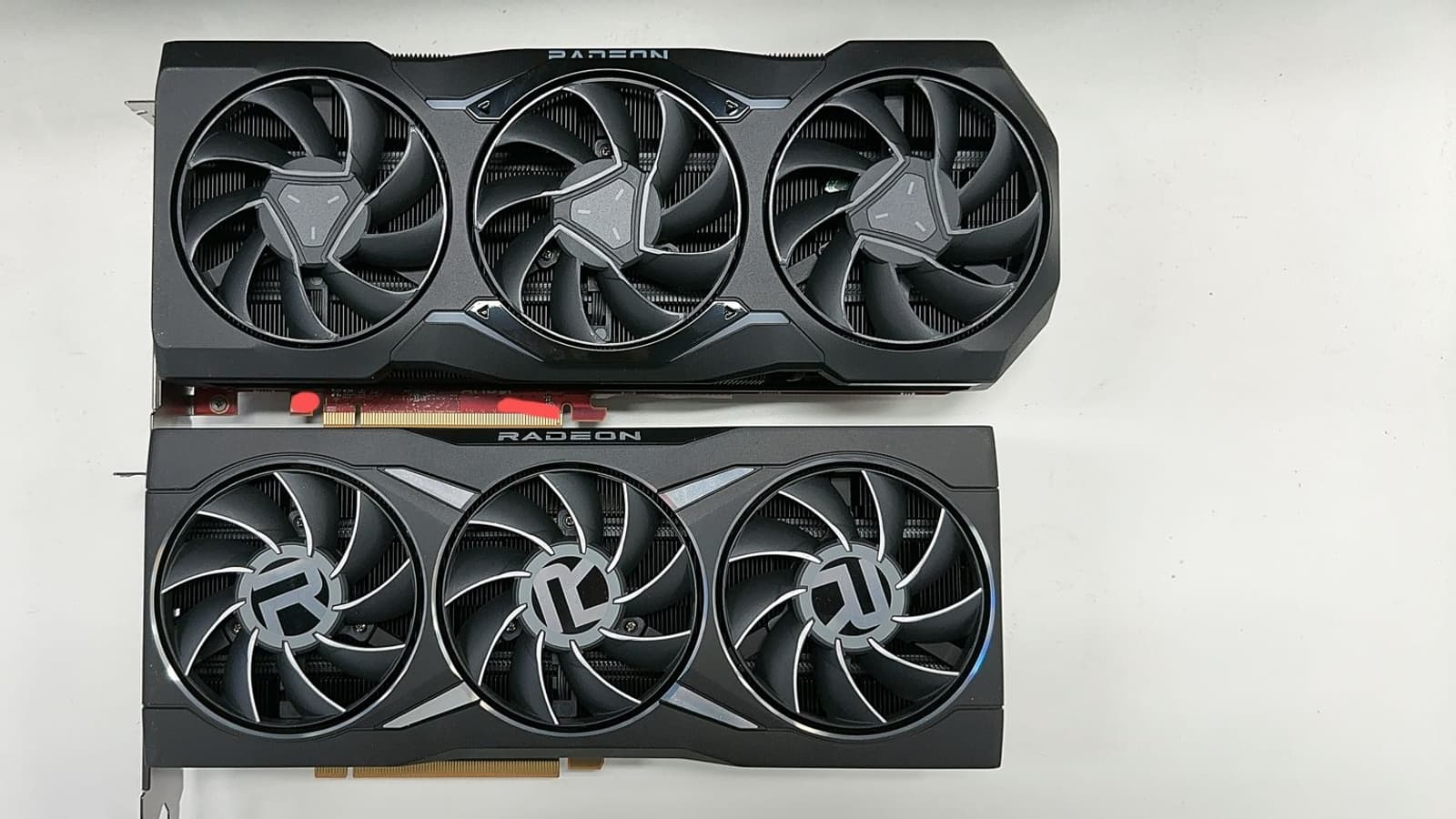 На снимке рядом с RX 6900 XT (она снизу) запечатлён прототип нового адаптера AMD, но при этом, судя по всему, с точки зрения дизайна он либо идентичен, либо максимально близок к серийной карте, так как сама AMD нам уже показывала изображения.