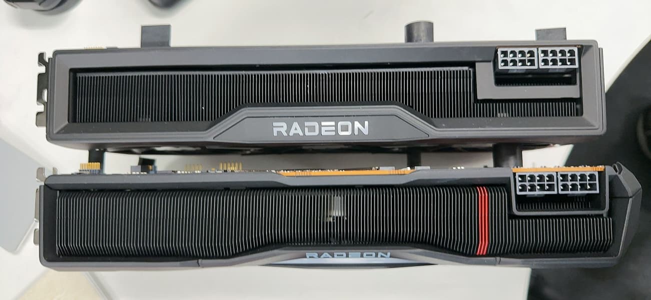 Из важного можно отметить несколько аспектов. Во-первых, два восьмиконтактных разъёма, то есть AMD действительно решила не использовать новый порт PCIe 5.0. Во-вторых, и это исходит из первого пункта, новинки AMD точно не будут сильно прожорливыми, так как указанная конфигурация разъёмов питания говорит об энергопотреблении не более 375 Вт.