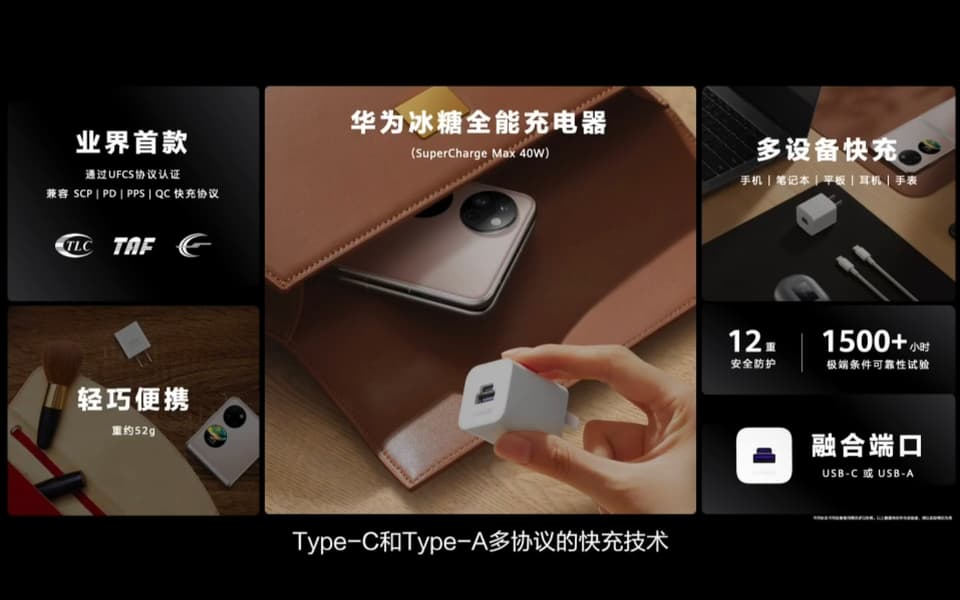 Емкость аккумулятора составила 4000 мА·ч, поддерживается быстрая зарядка мощностью 40 Вт. Вместе со смартфоном Huawei представила сверхкомпактный зарядный блок формата небольшого кубика. При этом в нем сразу два порта – USB-C и USB-A. Также представлены компактные мобильные аккумуляторы.