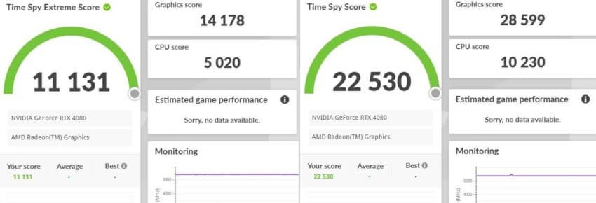 В TimeSpy и Time Spy Extreme грядущая новинка набирает соответственно 14 718 и 28 599 баллов. Это уже намного лучше, чем результаты в Geekbench, потому что в этом случае RTX 4080 быстрее своей предшественницы на 50% и более, а также на 32% обходит RTX 3090 Ti. При этом RTX 4090 быстрее младшей сестры на 37%.