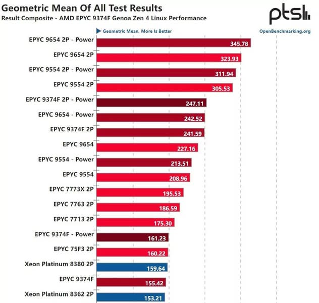 Серверные процессоры AMD Epyc поколения Genoa получились действительно впечатляющими. И дело не только в 96 ядрах у топовых моделей. Тесты 32-ядерного Epyc 9374F, работающего на частотах 3,4–4,0+ ГГц, показали, что один такой CPU в многопоточных нагрузках может опережать два 40-ядерных процессора Intel!