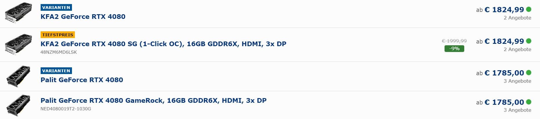 А что же в Европе? В Старом Свете, увы, всё печально. Так, например, в каталоге крупнейшего немецкого ретейлера Mindfactory нет ни одного варианта GeForce RTX 4080. Чуть лучше ситуацию с ассортиментом демонстрирует местный агрегатор Geizhals.de. Но это «чуть лучше» — всего пара моделей KFA2 и Palit от пары продавцов.
