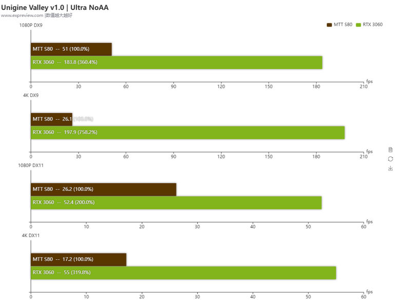 MTT S80 в бенчмарке Unigine Valley выступает на уровне GeForce GTX 1060, то есть сильно уступает современным картам RTX. Само собой, уровень GTX 1060 для полностью китайской разработки — это невероятное достижение, так как раньше китайские 3D-карты были в разы менее производительны. Но всё же в абсолютном выражении результат достаточно скромен, к тому же карта стоит 275 долларов, а энергопотребление под нагрузкой достигает 240 Вт и 115 Вт в простое, что очень много.