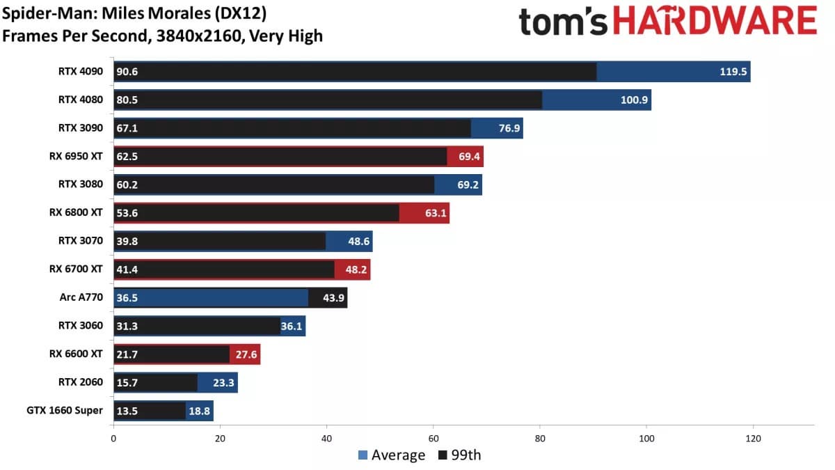 Как можно видеть, адаптеры Nvidia показывают себя намного лучше. К примеру, RTX 3080 выступает на уровне в среднем намного более мощной Radeon RX 6950 XT. При этом Intel Arc A770 чувствует себя очень неплохо, приближаясь к RTX 3070 и RX 6700 XT.