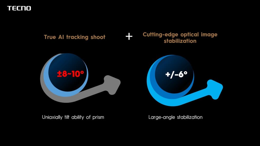 Как можно видеть, суть заключается в использовании двух призм, каждая из которых может незначительно вращаться вдоль одной оси. Одна призма может отклоняться от изначального состояния на 8 градусов, а другая на 10 градусов. Согласно данным Tecno, суммарно такая конфигурация позволяет отслеживать объект при отклонении до 16 градусов по одной оси и до 20 градусов по другой. Если точнее, сами призмы позволяют лишь стабилизировать изображение, а за отслеживание отвечает уже ИИ.