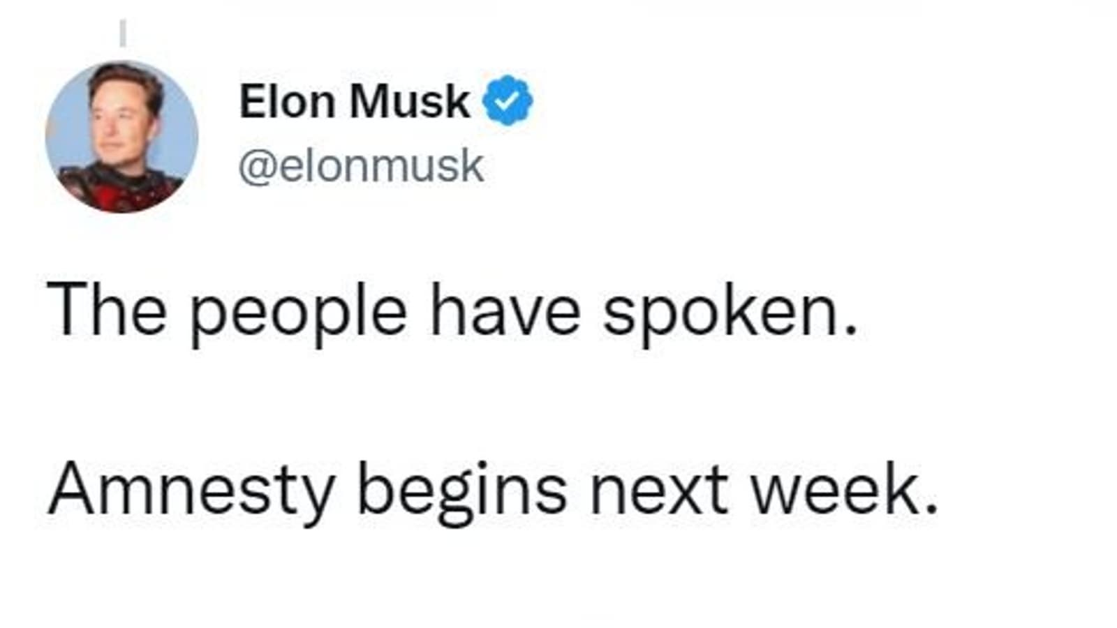 «Народ сказал своё слово. Амнистия начнётся на следующей неделе», — написал он, имея в виду устроенное им в среду голосование. В продлившемся сутки опросе приняли участие более 3 млн пользователей, 72,4% из них высказались за восстановление аккаунтов «при условии, что они не связаны с нарушением закона или рассылкой спама». Vox populi, vox Dei, — подытожил Маск, что в переводе с латыни значит «Глас народа — глас Божий».